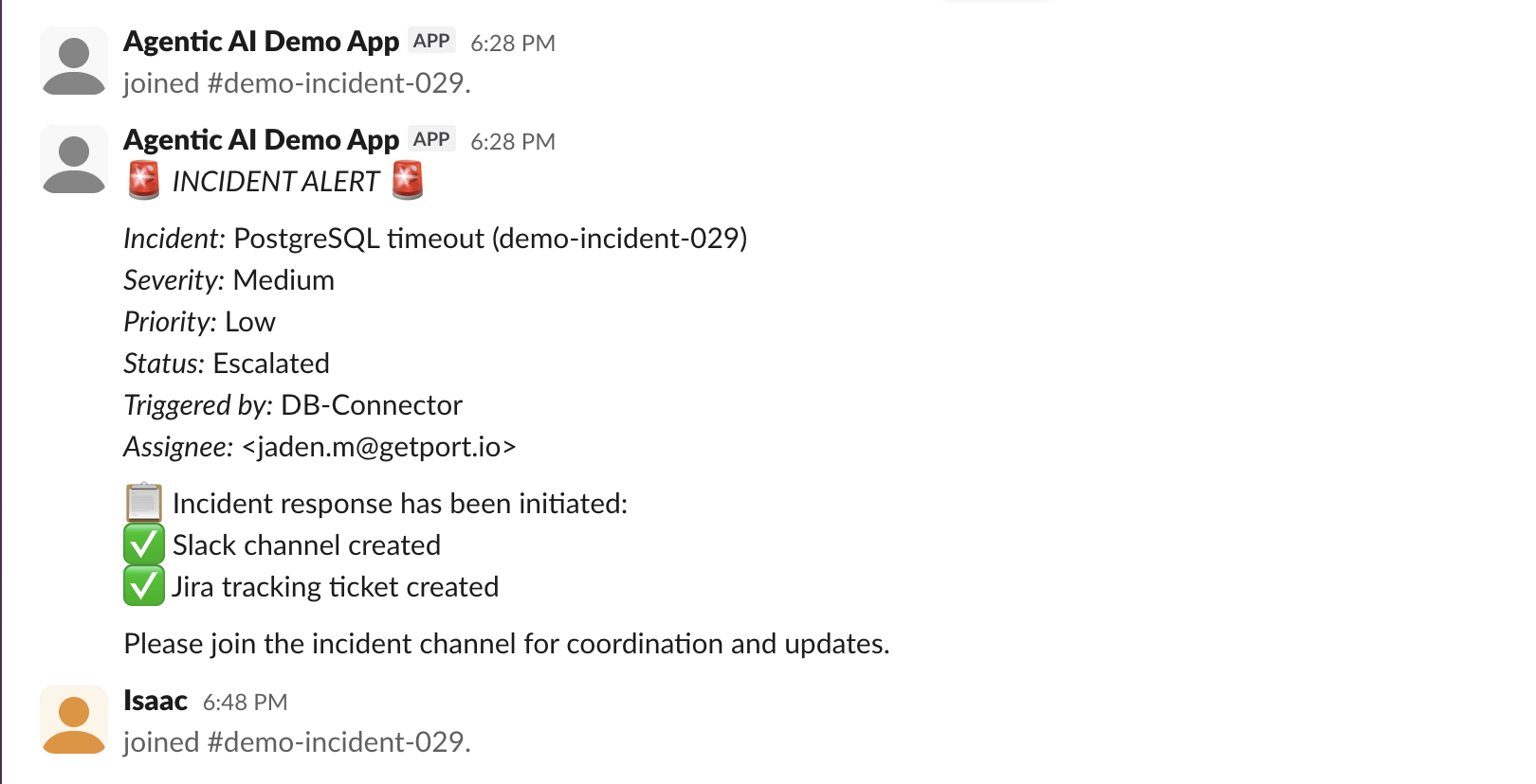 This guide demonstrates how to implement an AI-powered incident response system in Port where a single incident trigger activates an AI agent that intelligently orchestrates the entire setup. The AI agent has access to Port actions (create Slack channel, generate meeting link, create Jira ticket, notify teams) and automatically executes the right sequence based on the incident context.