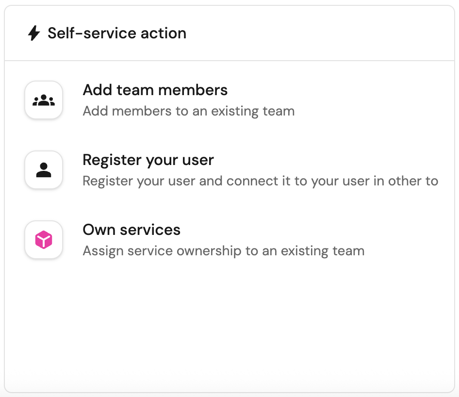 - Execute several self-service actions to onboard users to teams, register new users, and assign ownership of services to teams.